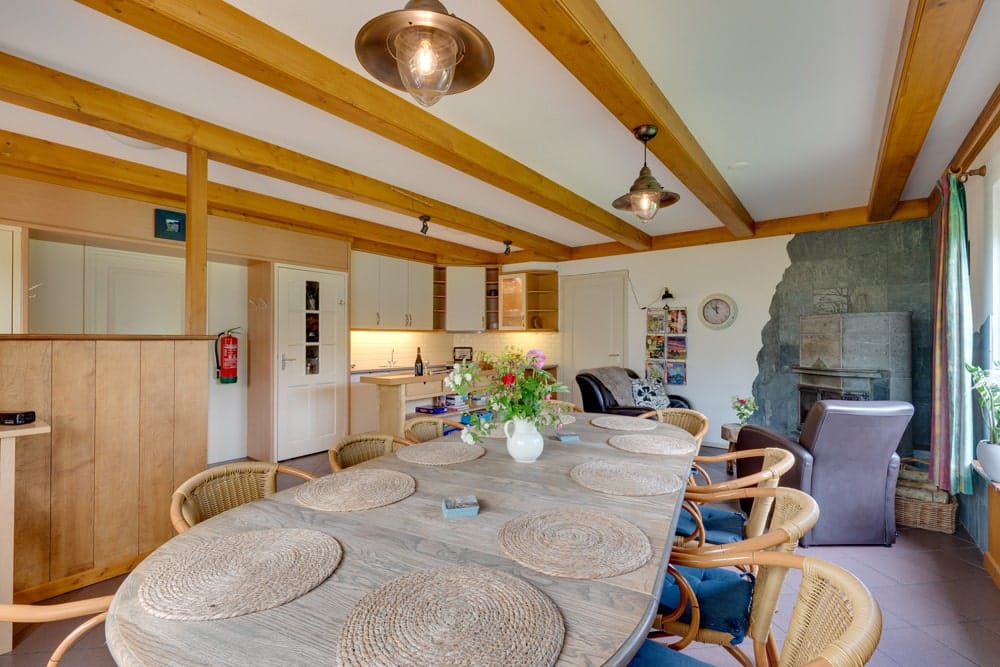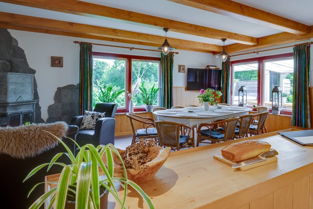Het vakantiehuis beschikt over vier comfortabele slaapkamers, waarvan drie met een eigen badkamer. In de verblijfsruimte met open keuken staat een lange eettafel die uitnodigt tot lange, gezellige diners. Hier kun je samen koken, eten, spelletjes doen of ontspannen bij de behaaglijke warmte van de speksteenkachel.